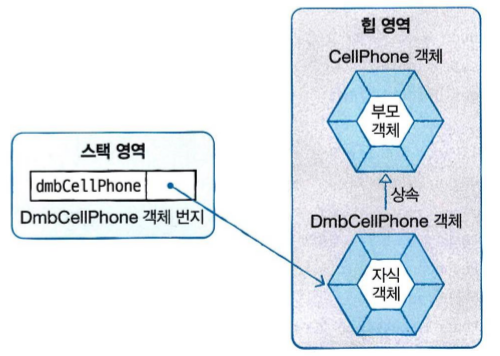 - DmbCellPhone 객체만 생성하는 것 처럼 보이지만, 사실은 내부적으로 부모인 CellPhone 객체가 먼저 생성되고 자식인 DmbCellPhone 객체가 생성된다.