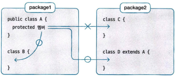 - 같은 패키지에서는 default와 같이 접근 제한이 없지만 다른 패키지에서는 자식 클래스만 접근을 허용