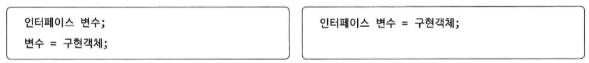 - 인터페이스로 구현 객체를 사용하려면 인터페이스 변수를 선언하고 구현 객체를 대입해야 한다