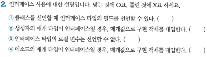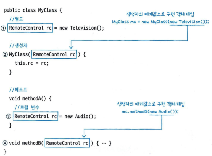 - 인터페이스가 생성자의 매개 변수 타입으로 사용될 경우: new 연산자로 객체를 생성할 때 구현 객체를 생성자의 매개값으로 대입할 수 있다.