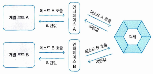 => 개발 코드는 객체의 내부 구조를 알 필요가 없고 인터페이스의 메소드만 알고 있으면 됨