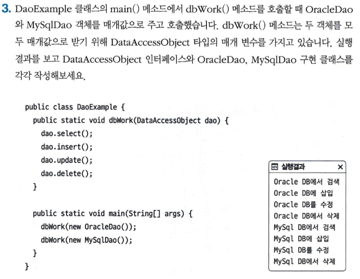 - 매개 변수의 타입이 인터페이스일 경우 어떠한 구현 객체도 매개값으로 사용할 수 있고 어떤 구현 객체가 제공되느냐에 따라 메소드의 실행 결과는 다양해질 수 있다.