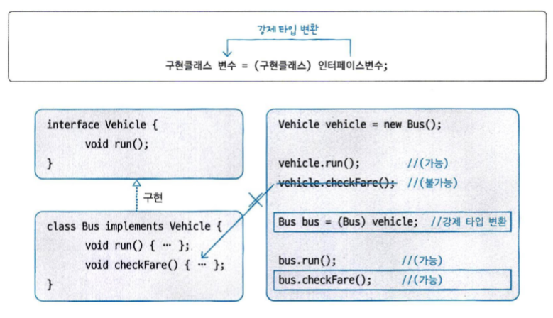 예를 들어 인터페이스에는 3개의 메소드가 선언되어 있고 클래스에는 5개의 메소드가 선언되어 있다면, 인터페이스로 호출 가능한 메소드는 3개뿐이다. 하지만 경우에 따라서 구현 클래스에 선언된 필드와 메소드를 사용해야하는 경우 강제 타입 변환을 해서 다시 구현 클래스 타입으로 변환한 다음, 구현 클래스의 필드와 메소드를 사용할 수 있다.