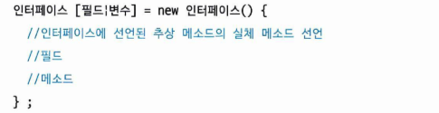 - 중괄호 {} : 인터페이스에 선언된 모든 추상 메소드의 실체 메소드를 작성(재정의)