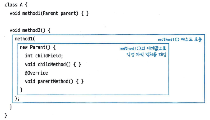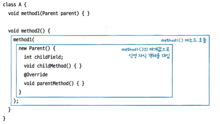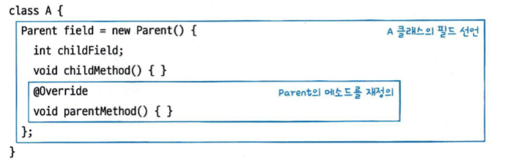 - 익명 자식 객체에 새롭게 정의된 필드와 메소드는 익명 자식 객체 내부에서만 사용되고 외부에서는 접근 불가능