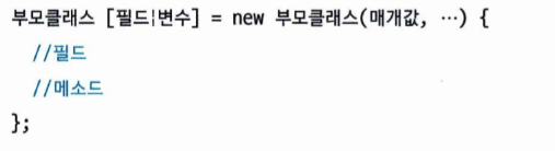 - ‘부모클래스(매개값, ...){… }' : 부모클래스를상속해서 중괄호{} 와같이 자식 클래스를 선언하라