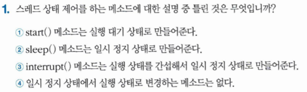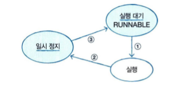 - 다음과 같이 Thread.sleepO 메소드를 호출한 스레드는 주어진 시간 동안 일시 정지 상태가 되고, 다시 실행 대기 상태로 돌아간다.