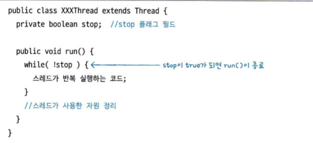 - 스레드를 안전하게 종료하기 위해서 stop 플래그를 이용하거나 interrupt() 메소드를 이용하는 방법이 있음.