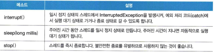 - Thread는 스레드를 즉시 종료하기 위해서 stop() 메소드를 제공하고 있는데, 이 메소드는 deprecated(중요도가 떨어져 이제 사용되지 않음)되었음