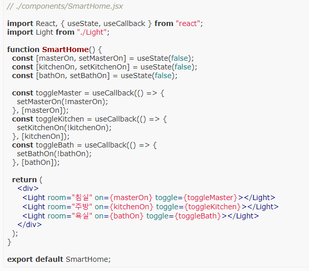 - smartHome 컴포넌트가 렌더링될 때 마다 toggle함수들의 참조값이 바뀌기 때문에 모든 light 컴포넌트가 리렌더링됨