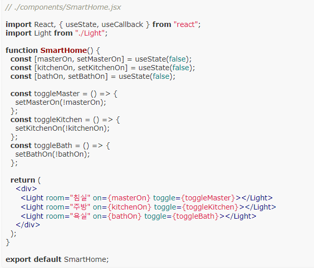 - smartHome 컴포넌트가 렌더링될 때 마다 toggle함수들의 참조값이 바뀌기 때문에 모든 light 컴포넌트가 리렌더링됨