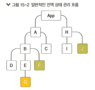 컴포넌트에게 데이터를 전달할 때 Props로만 데이터를 전달하게 되면 깊숙히 위치한 컴포넌트에 데이터를 전달해야 하는 경우, 여러 컴포넌트를 거쳐 연달아 Props를 설정해주어야 하기 때문에 불편하고 실수할 가능성이 높아짐(그림 15-2)