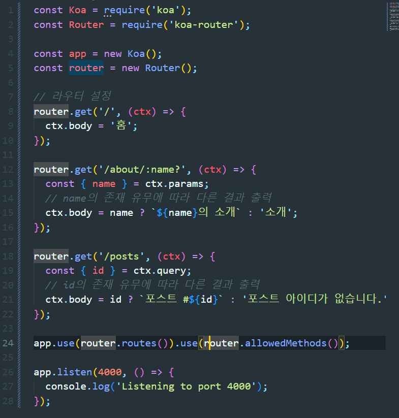 - 즉, Koa는 우리가 필요한 기능들만 붙여서 서버를 만들 수 있기 때문에 Express보다 훨씬 가벼움