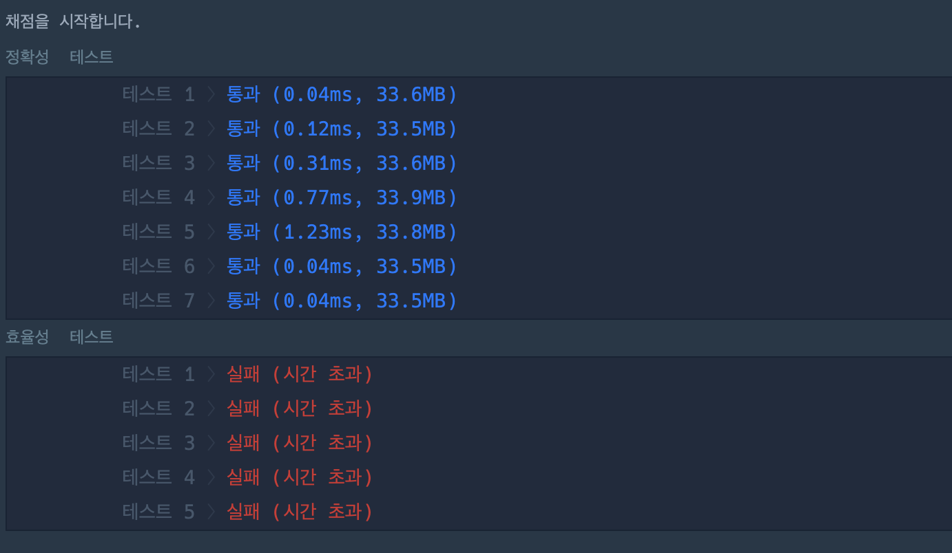 원래 푸는 방식대로 편하게 풀었더니 정확성 테스트는 100점이었지만 효율성테스트에서 시간초과로 다 실패를 했다.