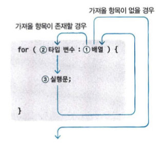 - 블록 내부의 실행문(③)이 모두 실행되면 다시 루프를 돌아 배열 (①)에서 가져올 다음 값이 존재하는지 평가합니다