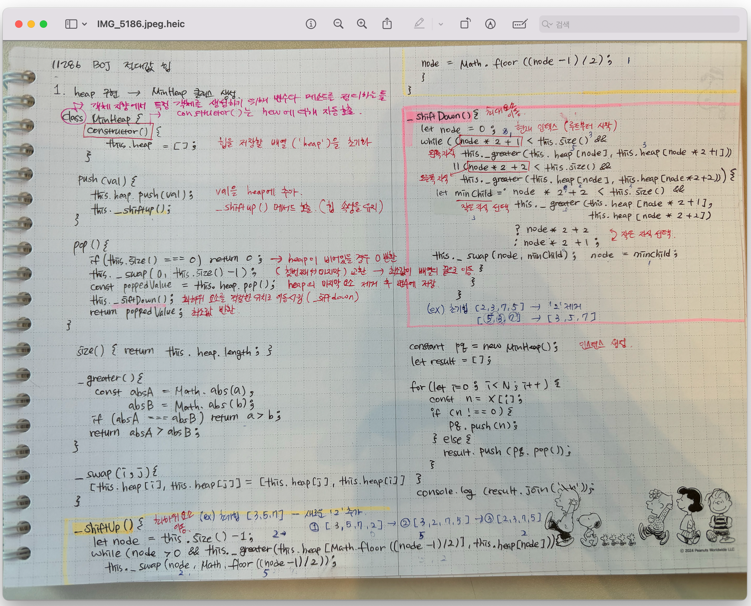 - MinHeap 클래스 내에 힙과 관련된 모든 메서드(push, pop, _siftUp, _siftDown, _greater, _swap)가 포함되어 있어 힙의 동작을 명확하게 이해하고 유지할 수 있다. 이는 코드의 모듈화를 돕고, 객체 지향 프로그래밍의 장점을 활용할 수 있게 한다.