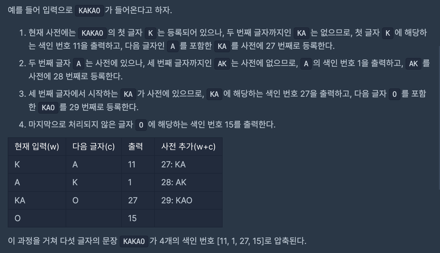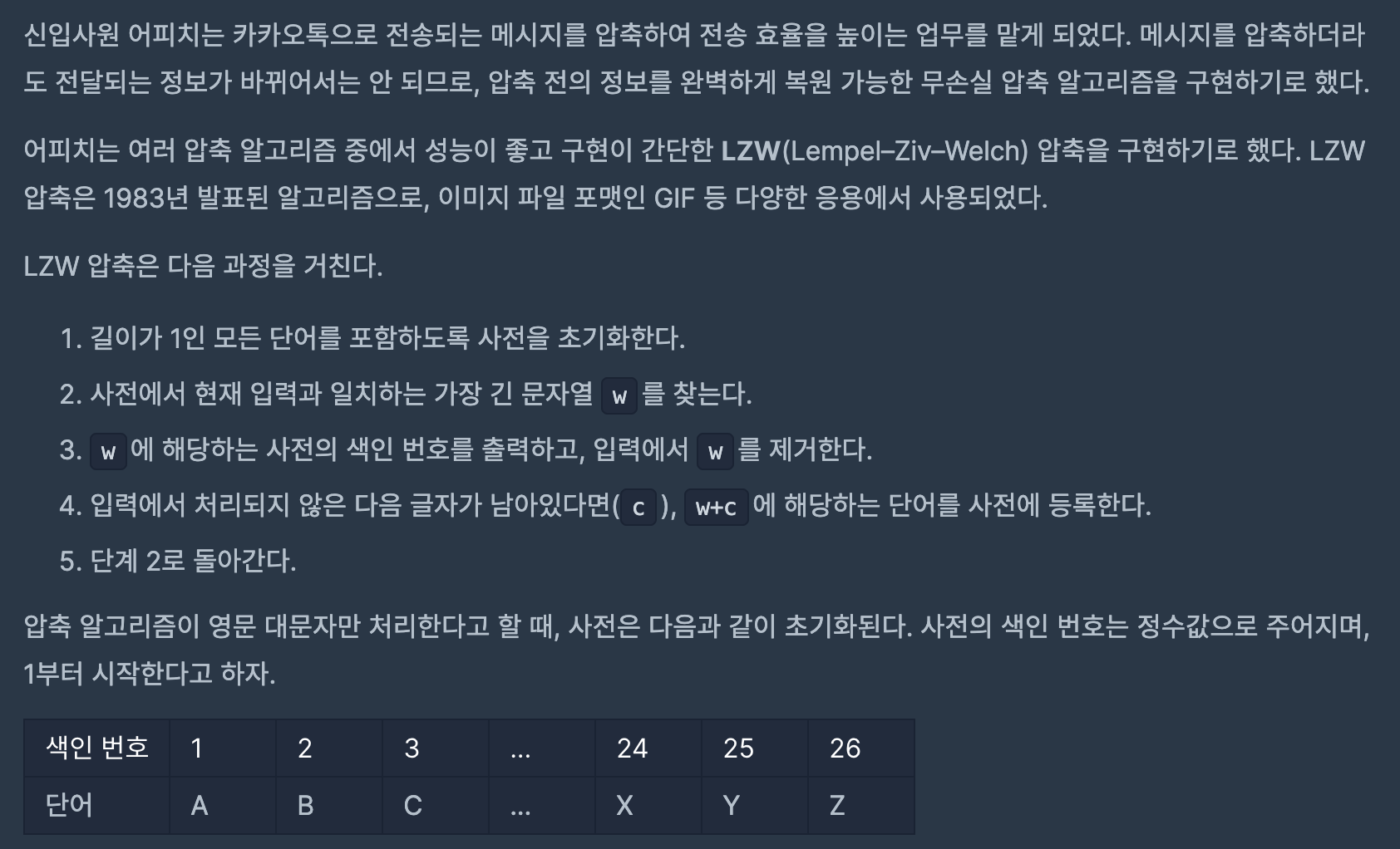 - 주어진 문자열을 압축한 후의 사전 색인 번호를 배열로 출력하라.